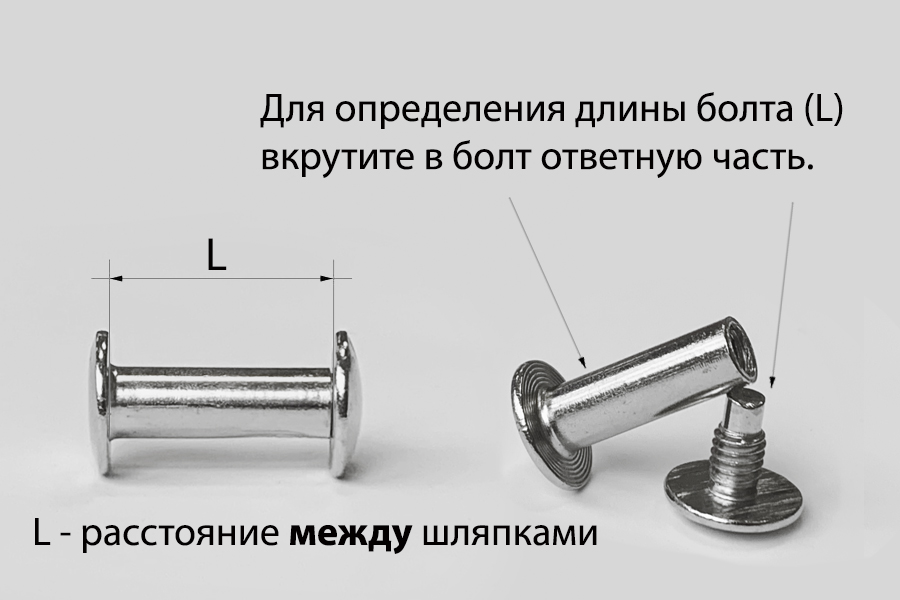 Длина ножки в закрученном виде 10 мм. Часть болта с внешней резьбой имеет шляпку со шлицом. Шляпка ответной части болта без шлица с внутренней резьбой.